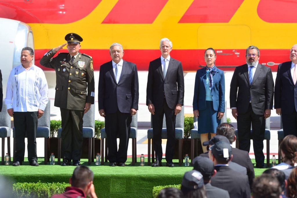 Reunidos en la Terminal de Carga y Aduana de esta terminal aérea, el Gobernador mexiquense estuvo al lado del Presidente López Obrador, de los Secretarios de la Defensa Nacional y de Infraestructura, Comunicaciones y Transportes, Luis Crecencio Sandoval González y Jorge Nuño Lara, respectivamente, así como de Claudia Sheinbaum Pardo, Jefa de Gobierno de la Ciudad de México y de Julio Menchaca Salazar, Gobernador de Hidalgo.