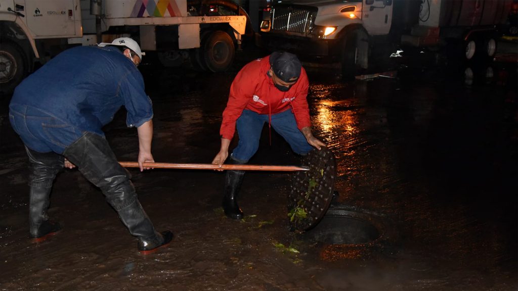 En el municipio de Ecatepec, la CAEM desplegó una cuadrilla de trabajadores para llevar a cabo la apertura y retiro de basura de pozos de visita, en la intersección de la avenida Nacional y calle Valentín Flores, colonia Santa María Chiconautla, eliminando los niveles pluviales cerca de las 23:00 horas de ayer.