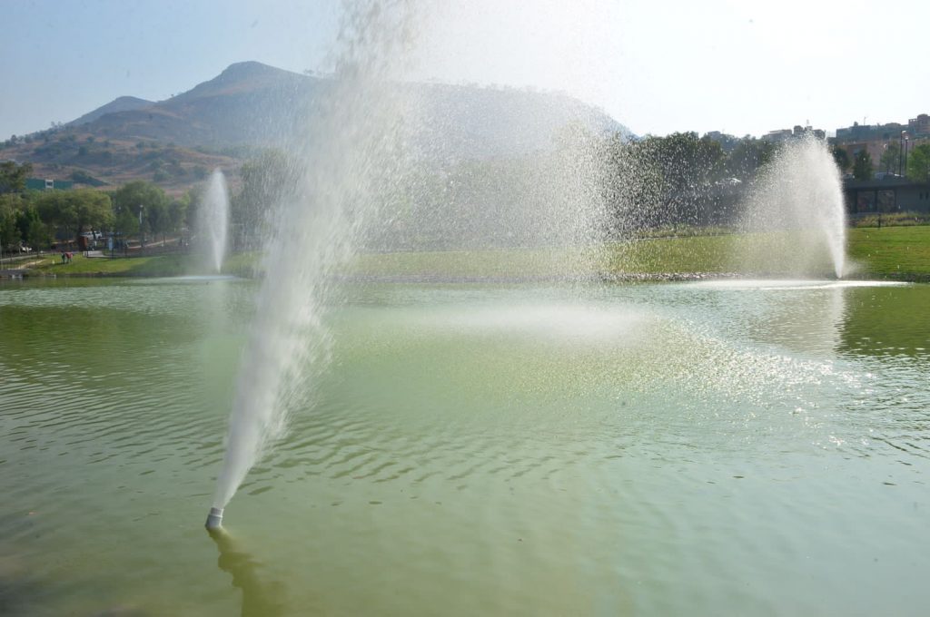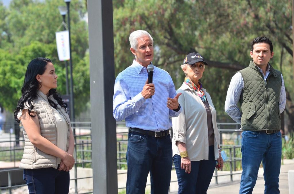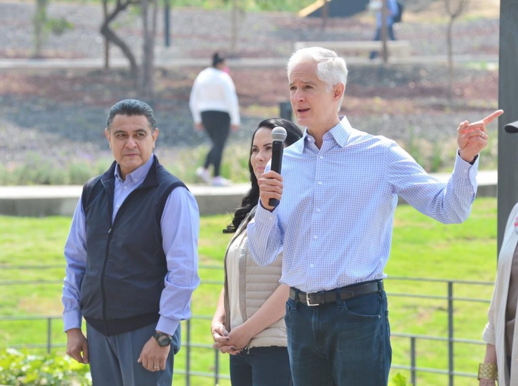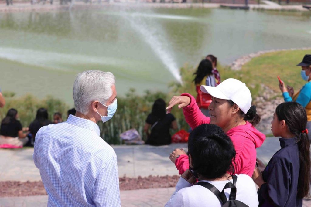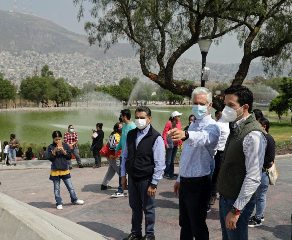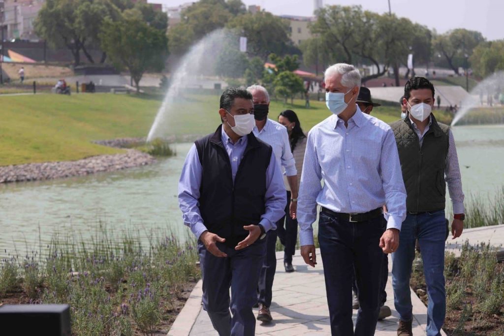 El titular del Ejecutivo estatal recorrió este parque, el cual cuenta con un lago artificial, cancha de futbol soccer de pasto sintético, canchas de usos múltiples y frontón, área de exposiciones, área de parkour, trotapista, ciclopista, teatro al aire libre, área comercial, gimnasio al aire libre, mirador – jagüey, fuentes interactivas, entre otros, además de que tiene 50 mil plantas sembradas que permiten recuperar un espacio verde.
