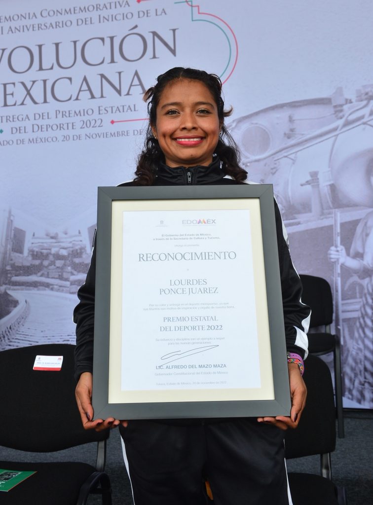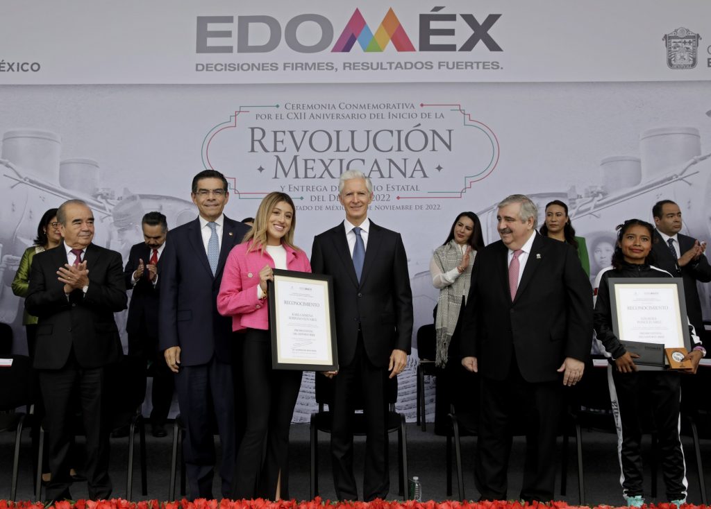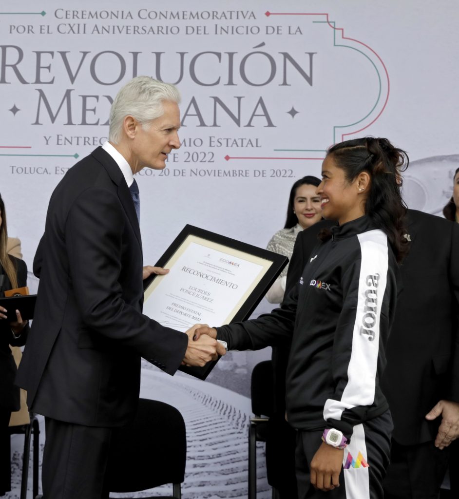Toluca, Estado de México, 20 de noviembre de 12022. En la conmemoración del 112 Aniversario de la Revolución Mexicana, el Gobernador Alfredo Del Mazo Maza entregó el Premio Estatal del Deporte a Lourdes Ponce Juárez, Karla Ximena Serrano Olivares e Isaac Cortés García, por sus destacados resultados en las disciplinas en las que compiten.