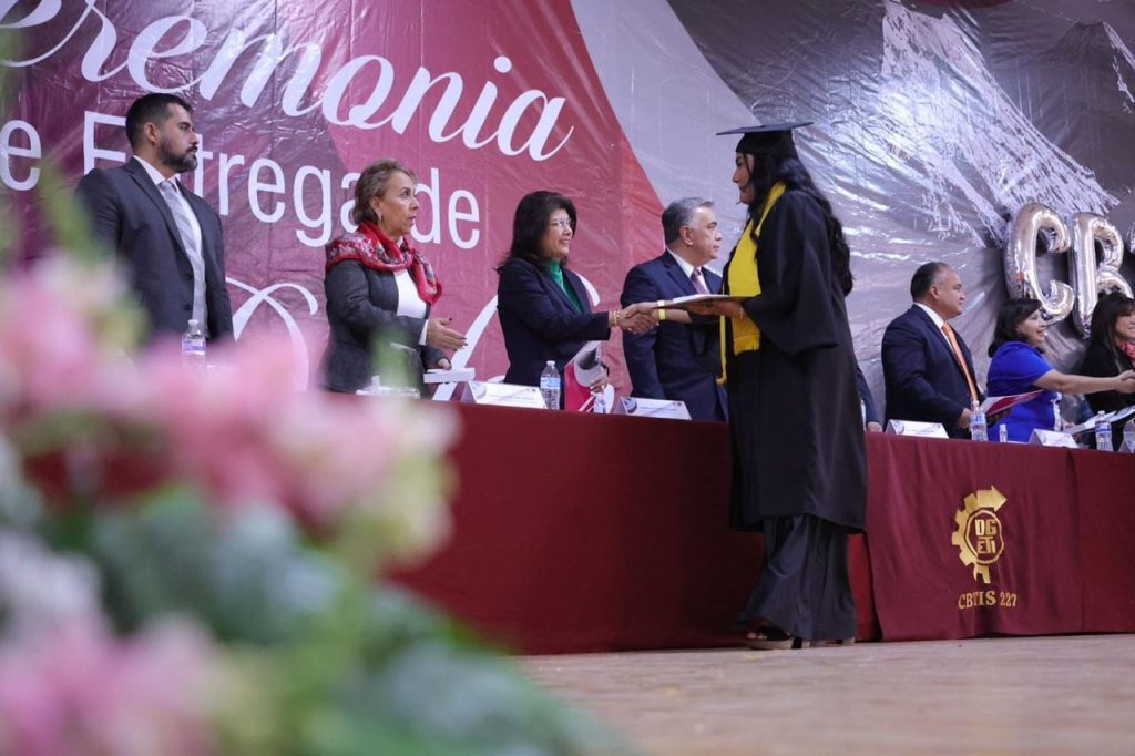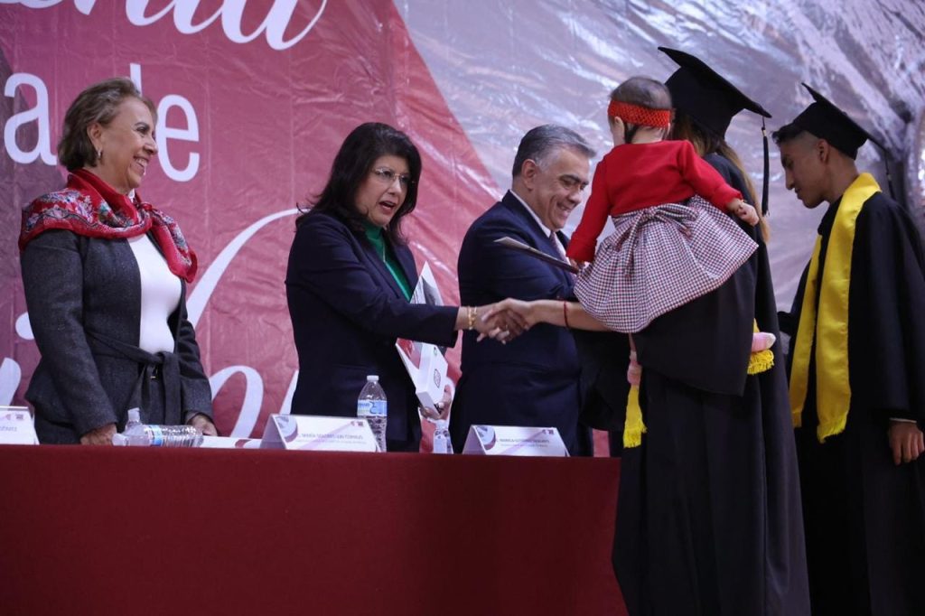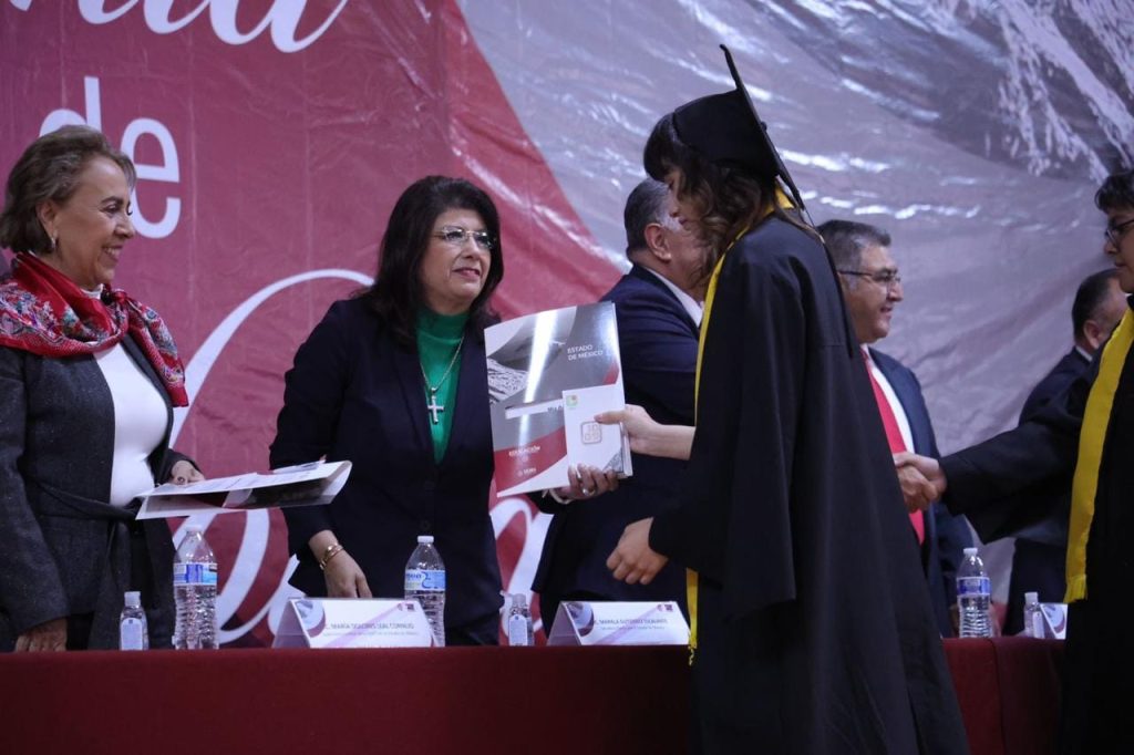 Al participar en la ceremonia de entrega de títulos y certificados de estudiantes del CBETIS 165 y del CETIS 35, en Toluca como en Tlanepantla, Mariela refrendó que de la mano de la próxima Presidenta de la República “construiremos más universidades y preparatorias para elevar la cobertura en el nivel medio superior en un 55 % como se ha proyectado”.