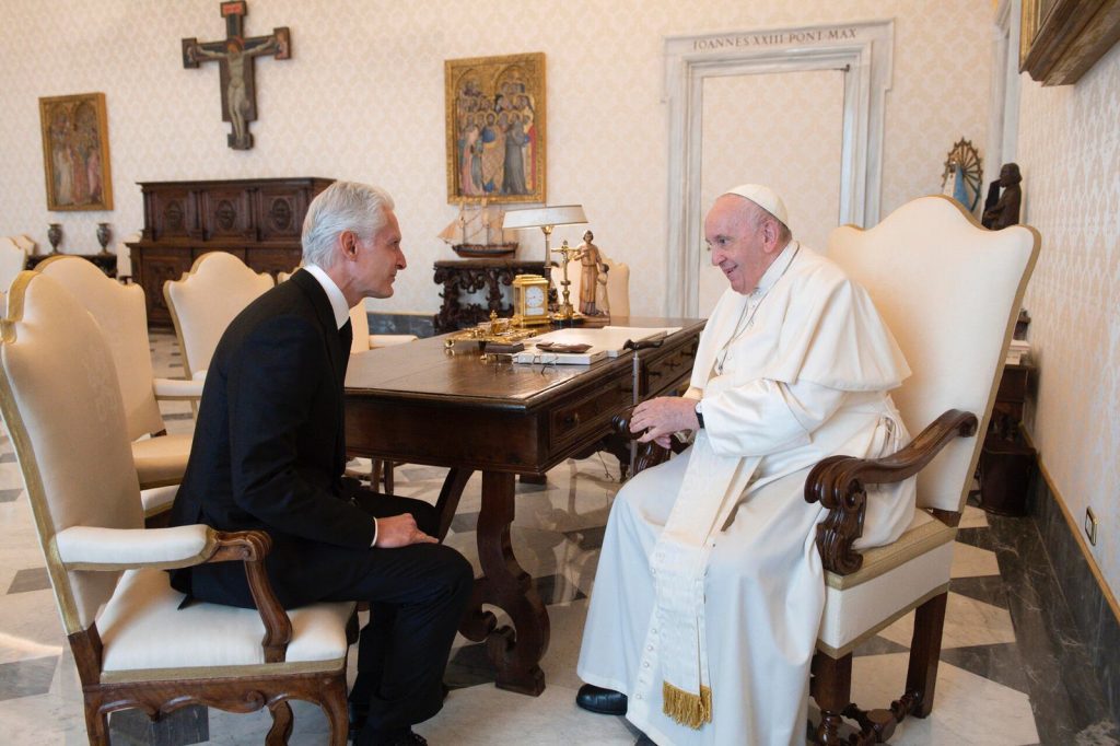 Ciudad del Vaticano, 11 de octubre de 2022.  Durante su gira internacional por el país de Italia y el Vaticano, el Gobernador del Estado de México, Alfredo Del Mazo Maza, se reunió con el Papa Francisco.